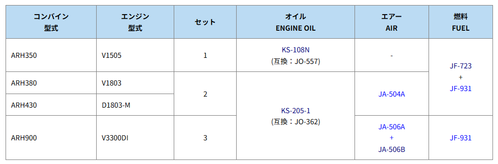 下表は、クボタ コンバイン ARHタイプ エレメントセットの適合表です。| コンバイン 型式 | セット | オイル ENGINE OIL | エアー AIR | 燃料 FUEL |