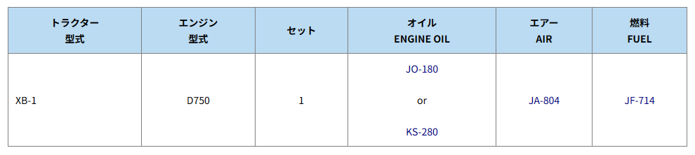 下表は、クボタ トラクター XBタイプ エレメントセットの適合表です。| トラクター 型式 | セット | オイル ENGINE OIL | エアー AIR | 燃料 FUEL |