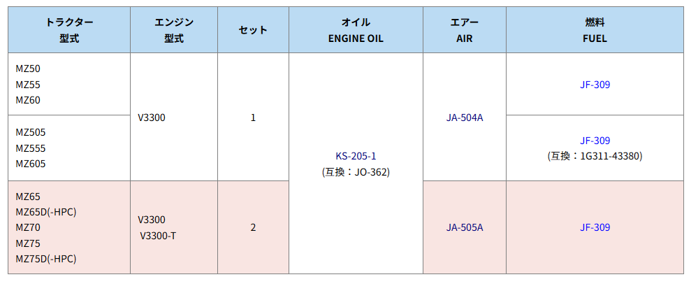 下表は、クボタ トラクター MZタイプ エレメントセットの適合表です。| トラクター 型式 | セット | オイル ENGINE OIL | エアー AIR | 燃料 FUEL |