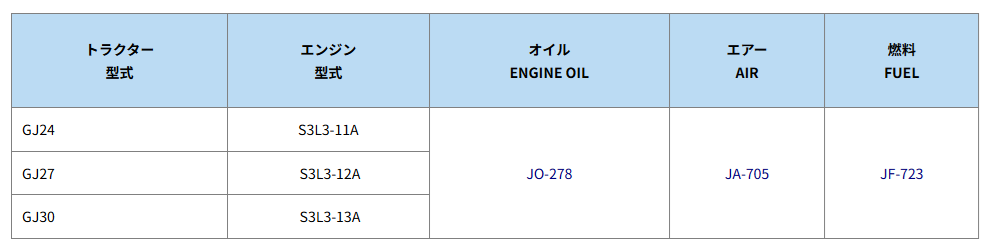 下表は、三菱 トラクター GJタイプ エレメントセットの適合表です。| トラクター 型式 | オイル ENGINE OIL | エアー AIR | 燃料 FUEL |