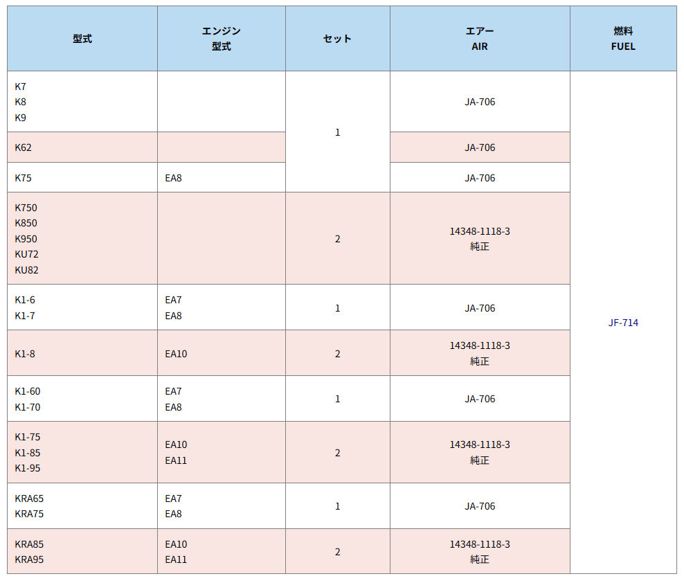 | 型式 | セット | エアー AIR | 燃料 FUEL |