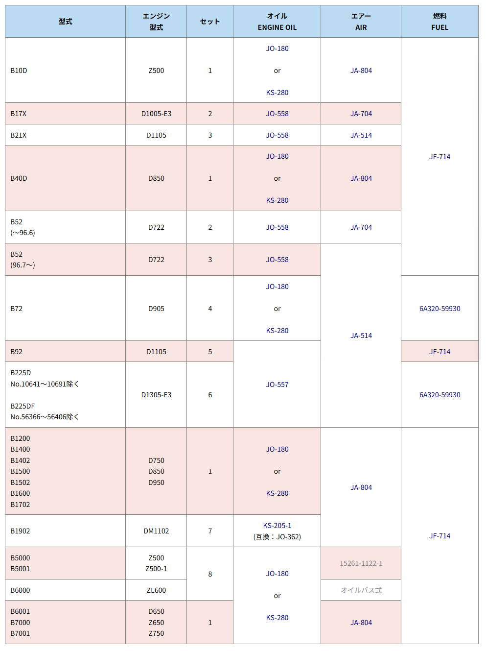 下表は、クボタ トラクター Bシリーズ エレメントセットの適合表です。※ユニオン産業製(頭文字:JO/JA/JF)、ケーエス製(頭文字:KS)以外は純正でのご案内です。