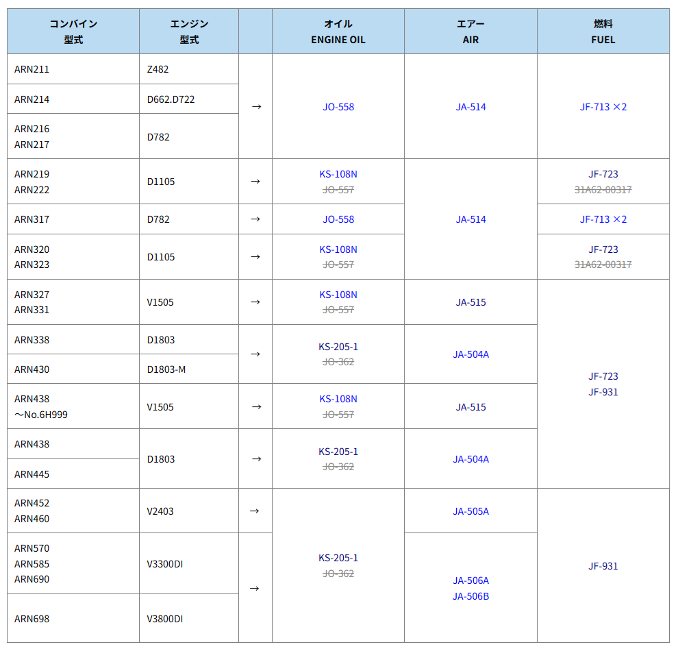 下表は、クボタ コンバイン ARNタイプ エレメントセットの適合表です。| コンバイン 型式 | オイル ENGINE OIL | エアー AIR | 燃料 FUEL | |