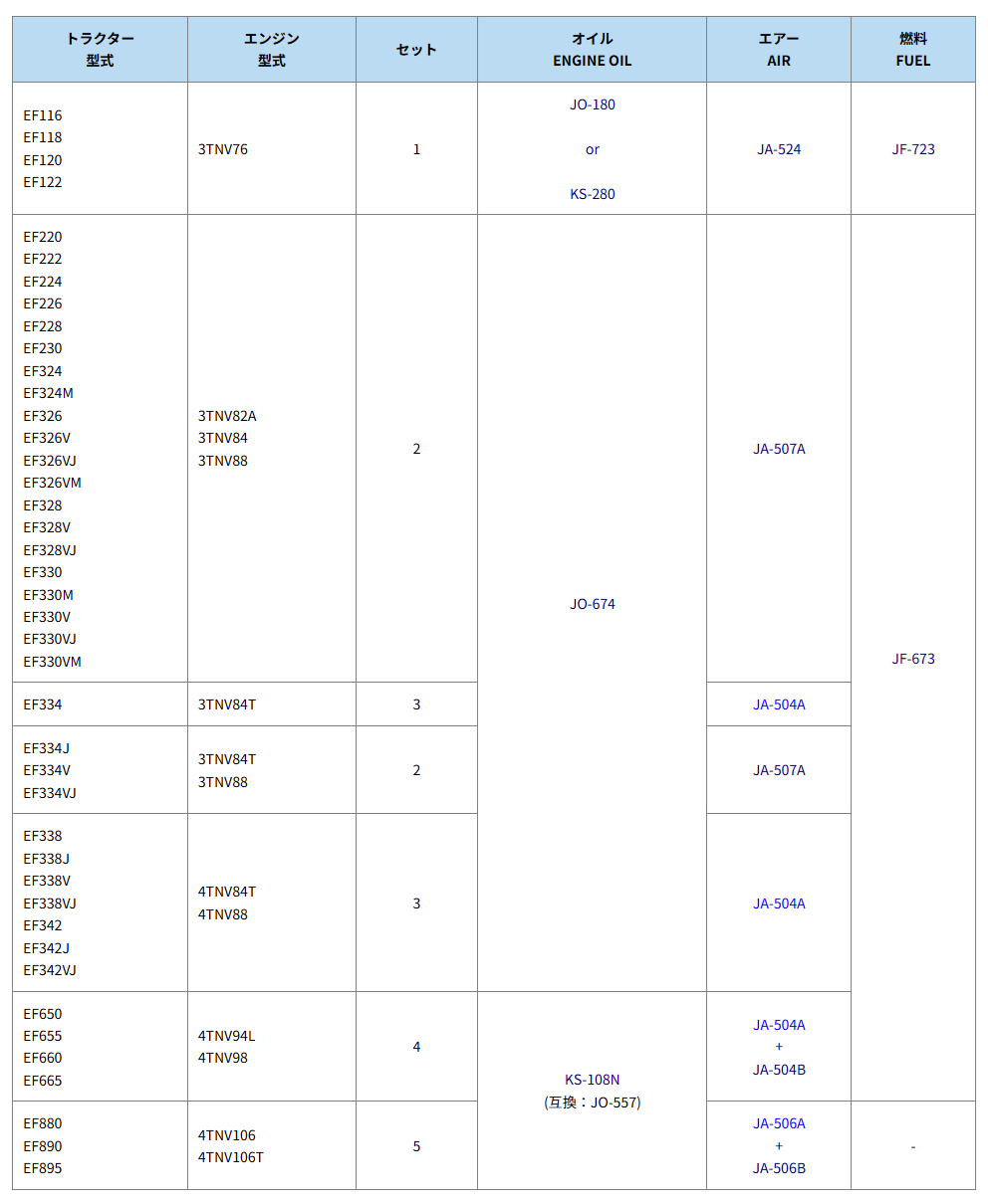 下表は、ヤンマー トラクター EFタイプ エレメントセットの適合表です。※ユニオン産業製(頭文字:JO/JA/JF)、ケーエス製(頭文字:KS)以外は純正でのご案内です。