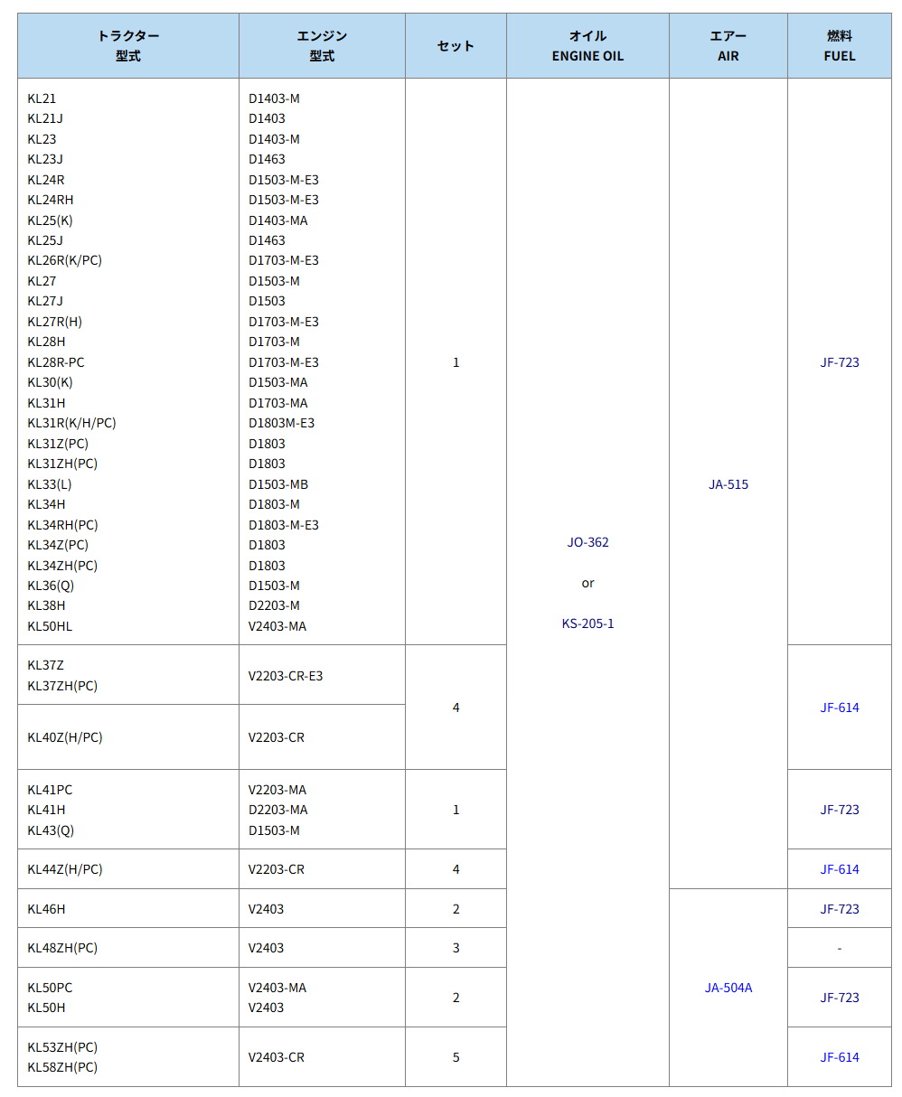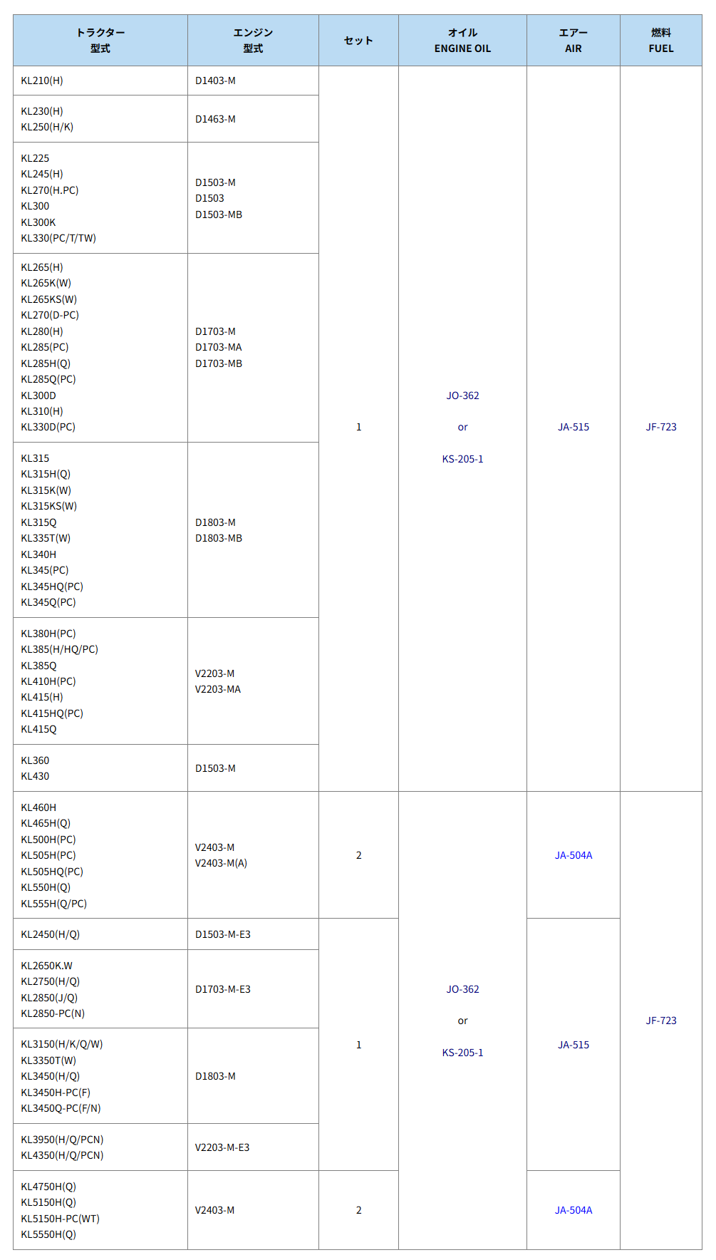 下表は、クボタ トラクター KLシリーズ エレメントセットの適合表です。| 型式 | セット | オイル ENGINE OIL | エアー AIR | 燃料 FUEL |