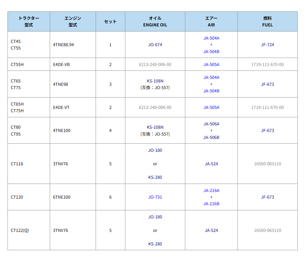 | トラクター 型式 | セット | オイル ENGINE OIL | エアー AIR | 燃料 FUEL |