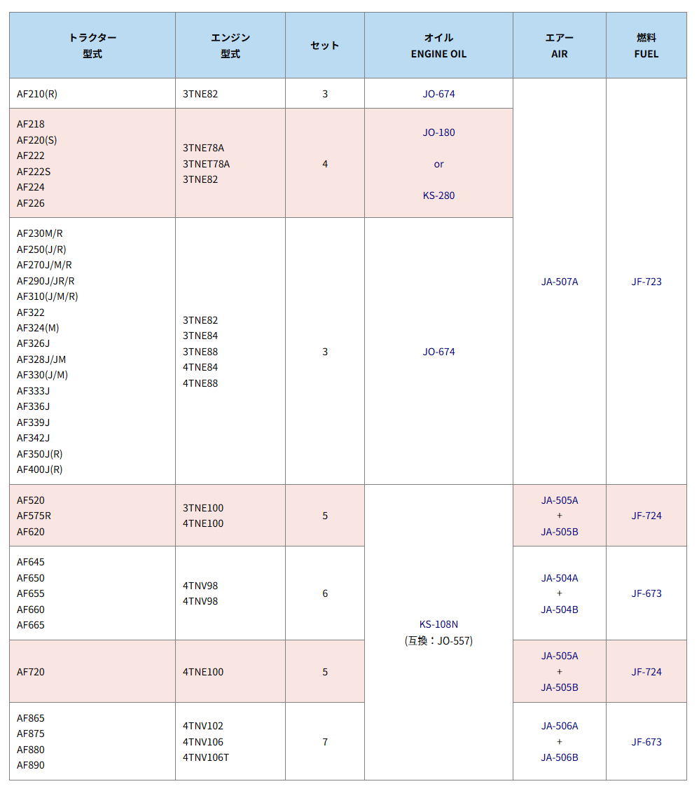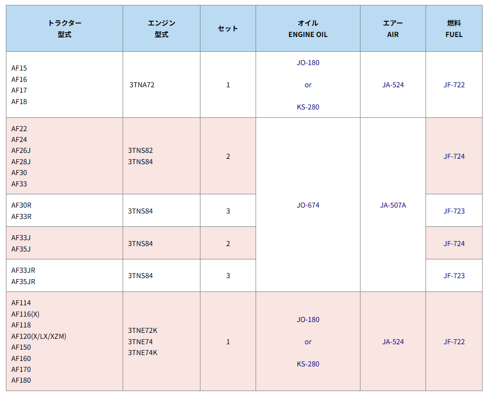 下表は、ヤンマー トラクター AFタイプ エレメントセットの適合表です。| トラクター 型式 | セット | オイル ENGINE OIL | エアー AIR | 燃料 FUEL |